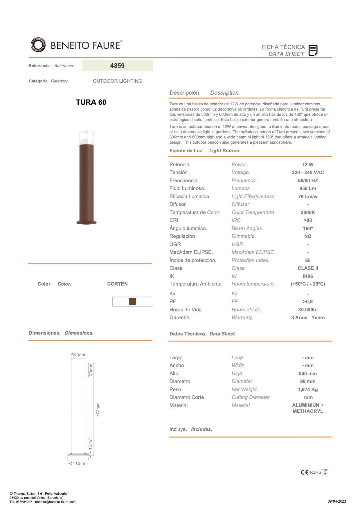 Tura ist eine Outdoor-LED-Leuchte mit einer Leistung von 12W und einer Farbtemperatur von 3.000K und 4.000K. Hergestellt aus Aluminium und Methacrylat mit jeweils einem Finish in Weiß, Schwarz oder Corten. Die Leuchte hat einen Abstrahlwinkel von 180 °, eine IP65 und IK06 Klassifizierung. Die Tura Leuchte ist in zwei Versionen erhältlich: 300mm und 600mm Höhe.
