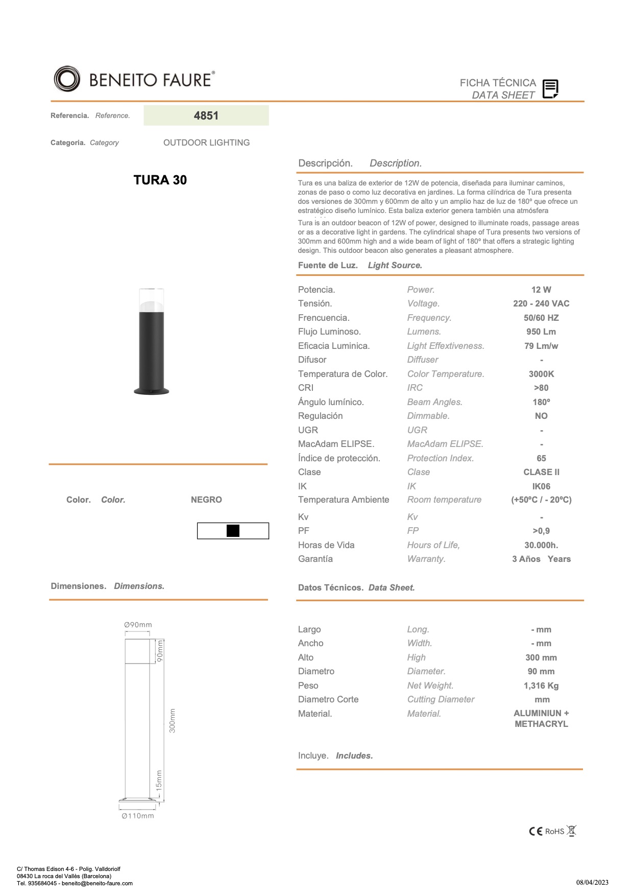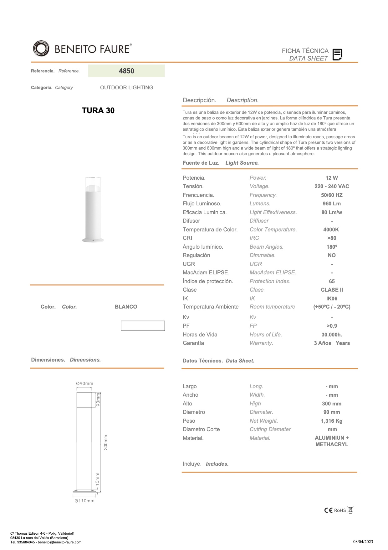 Tura ist eine Outdoor-LED-Leuchte mit einer Leistung von 12W und einer Farbtemperatur von 3.000K und 4.000K. Hergestellt aus Aluminium und Methacrylat mit jeweils einem Finish in Weiß, Schwarz oder Corten. Die Leuchte hat einen Abstrahlwinkel von 180 °, eine IP65 und IK06 Klassifizierung. Die Tura Leuchte ist in zwei Versionen erhältlich: 300mm und 600mm Höhe.