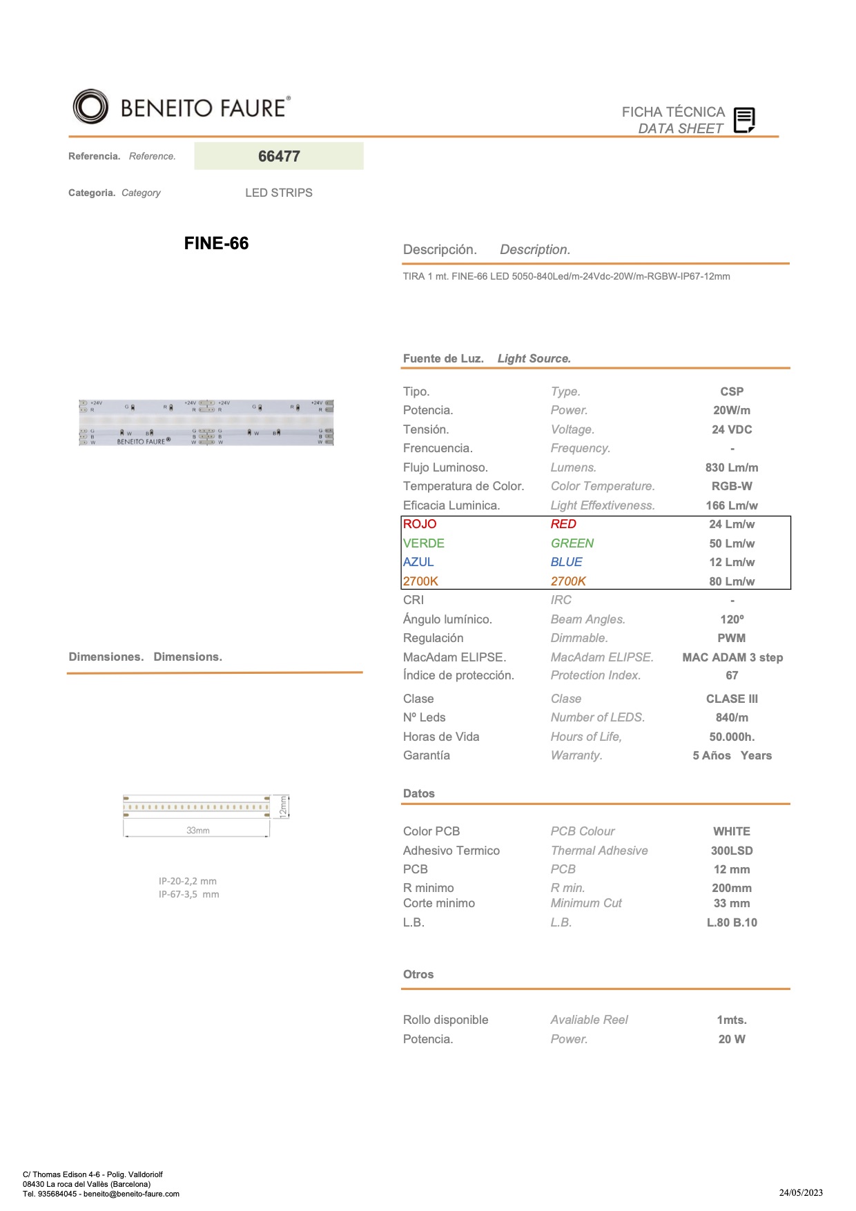 FINE-66 LED-STRIP 1m 840LED/m IP67 24VDC 20W/m 1050Lm/m RGB-W CRI90 12mm
