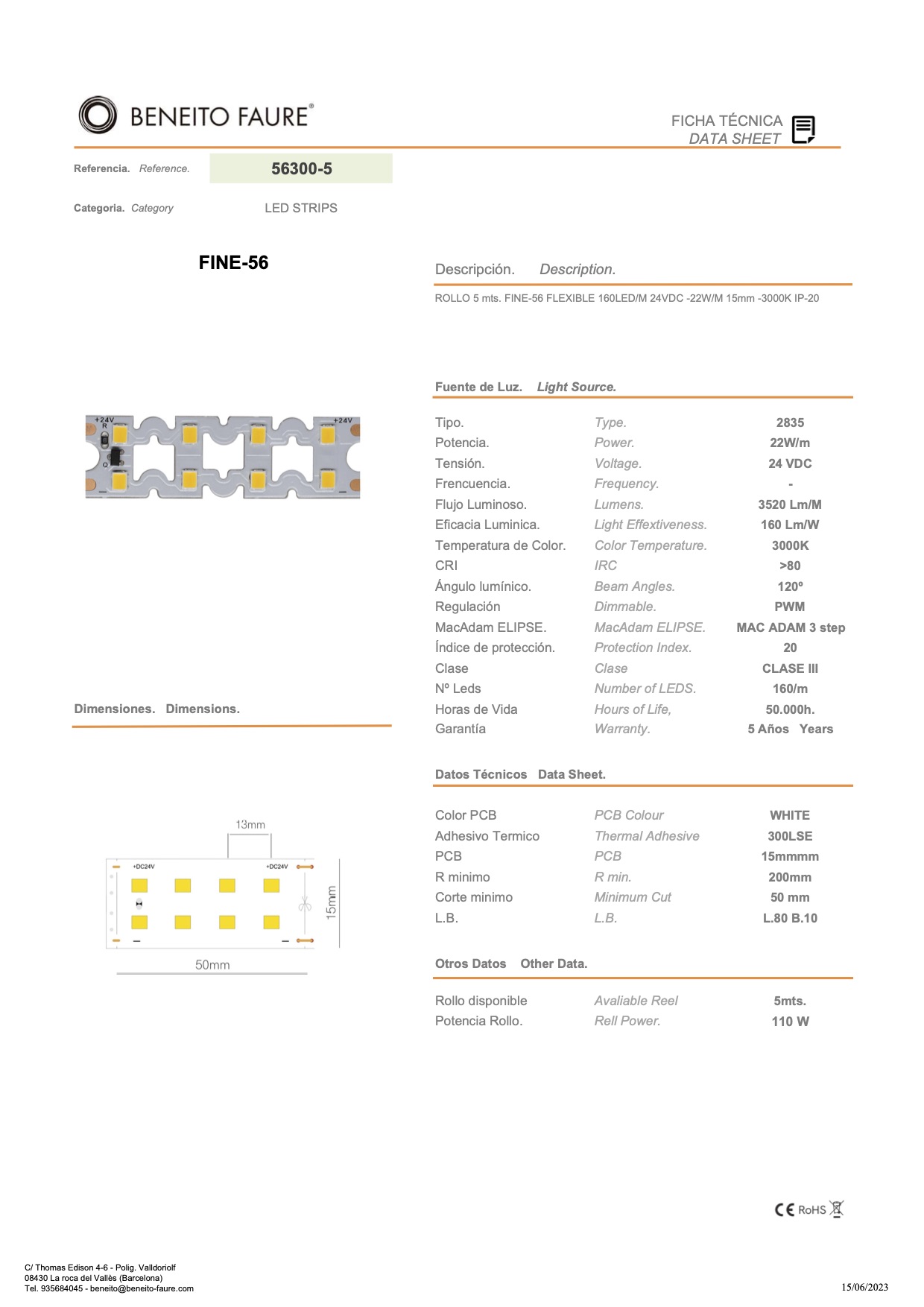 FINE-56 LED-STRIP 5m ROLLE 160LED/m IP20 24VDC 22W/m 155-170Lm/W 15mm
