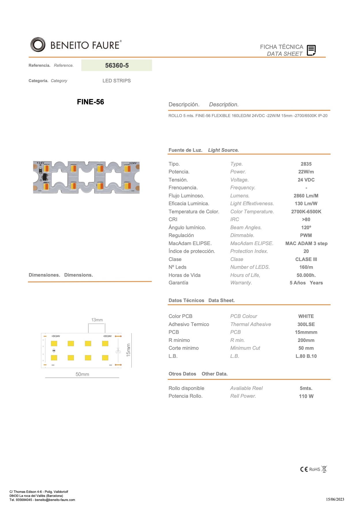 FINE-56 LED-STRIP 5m ROLLE CCT 160LED/m IP20 24VDC 22W/m 130Lm/W 15mm