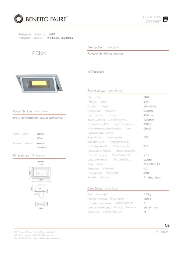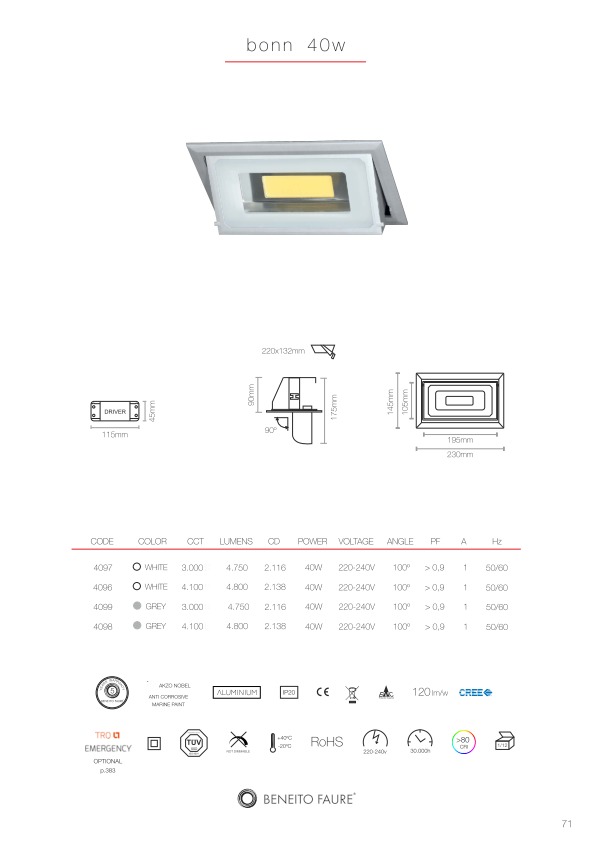 BONN LED Einbaudownlight WEISS 40W rechteckig kippbar 100° 3.000K