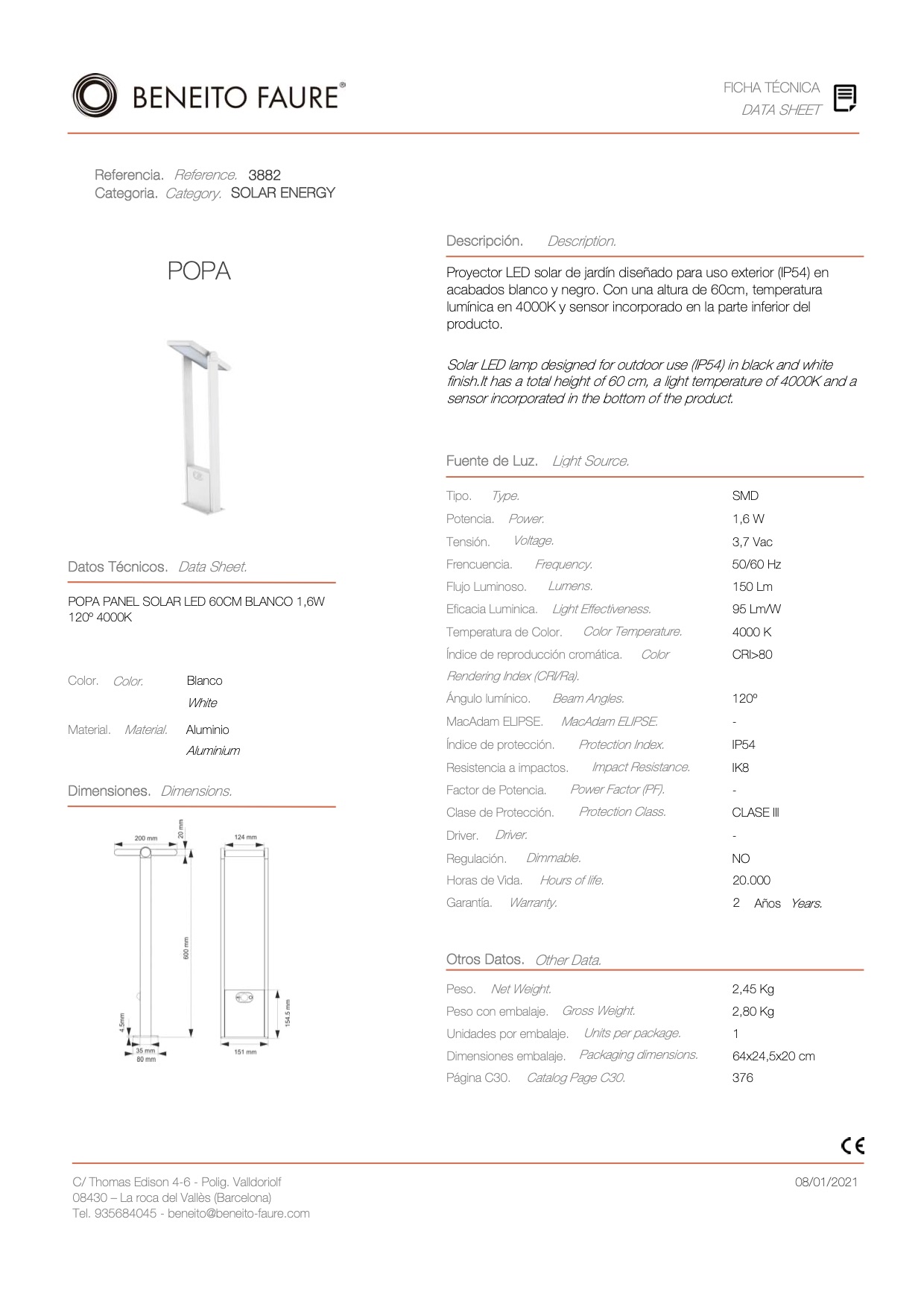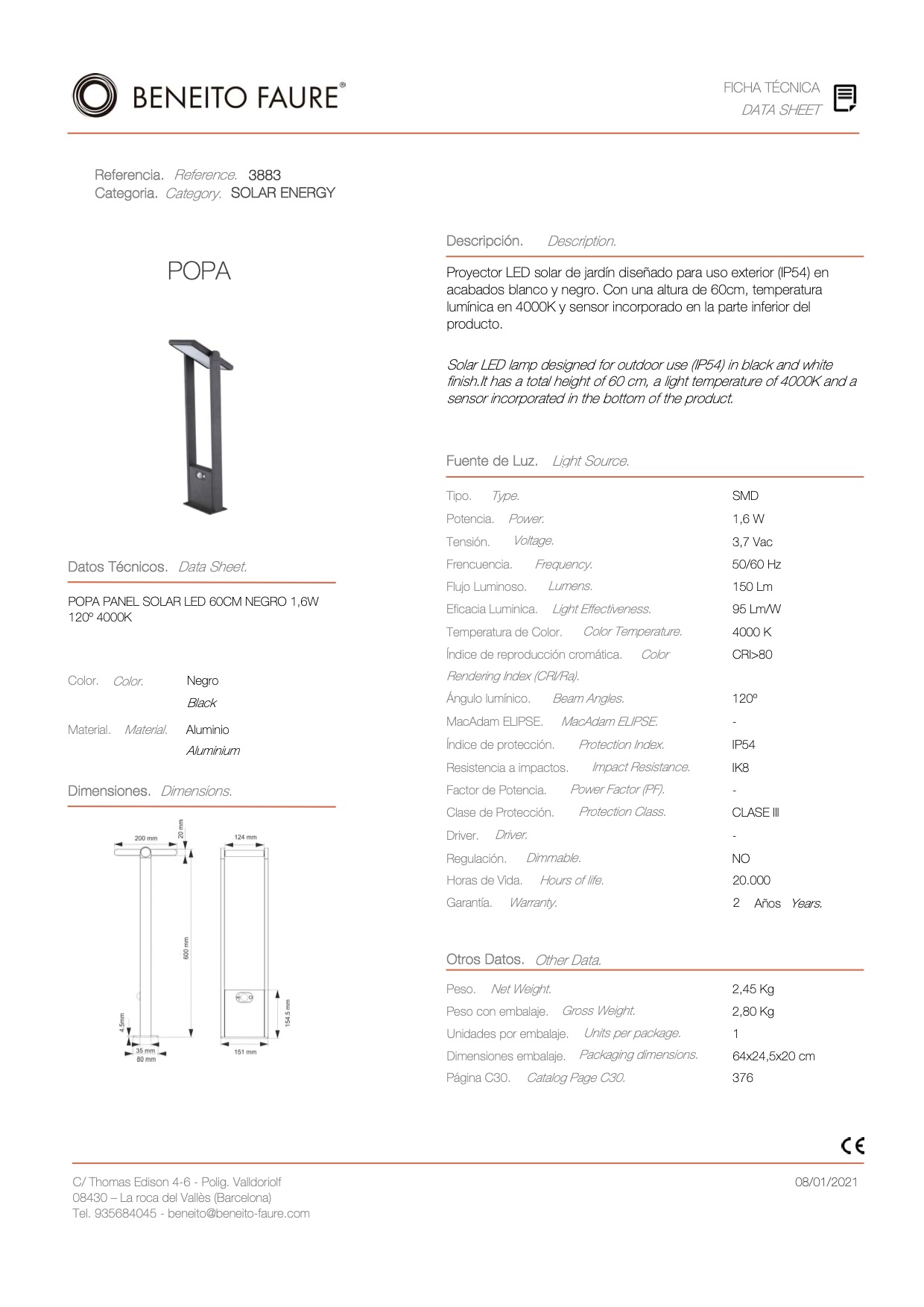 POPA SOLAR Sensor Stehleuchte 1,6W 120° 4.000K 600mm