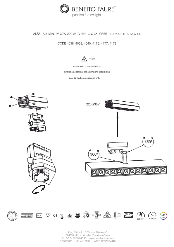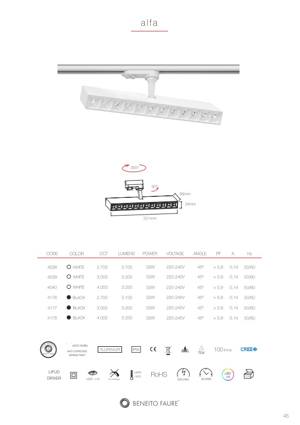 ALFA 3-Phasen Strahler mit CREE LED’s. Moderne dreh- und schwenkbarer 3-Phasen Strahler aus hochwertigem AluminiumAbstrahlwinkel 45°. Der Strahler lässt sich drehen, ebenso lässt sich dieser auch am Gestell schwenken. Für jeden Einsatz die richtige Lichtfarbe 2.700K, 3.000K und 4.000K mit einer Leistung von 20W bei 3.100lm – 3.100lm. Erhältlich in weiß und schwarz.Mit ihren flexiblen Einstellmöglichkeiten setzt die ALFA Akzente in jeden Raum. Durch ihren breiten Einsatzbereich kann die ALFA zur Beleuchtung von Privat-, Geschäfts- und Ausstellungsräumen eingesetzt werden.