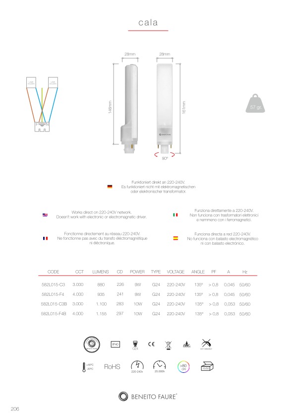 CALA PL  9W  G24 2-PINS  220V  135°  3.000K