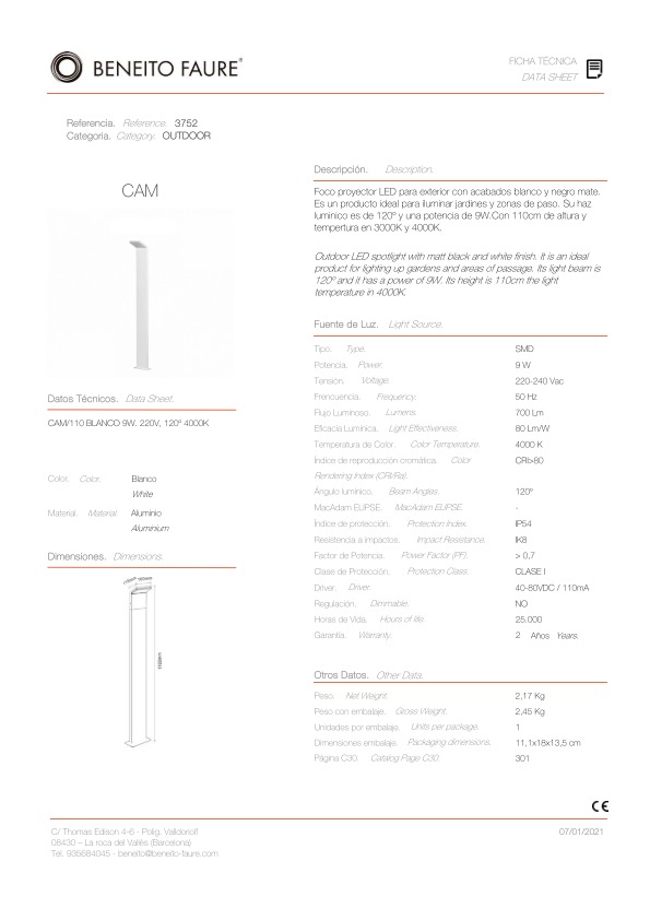 CAM Stehleuchte 110cm 9W 240V 120° 4.000K IP54 WEISS