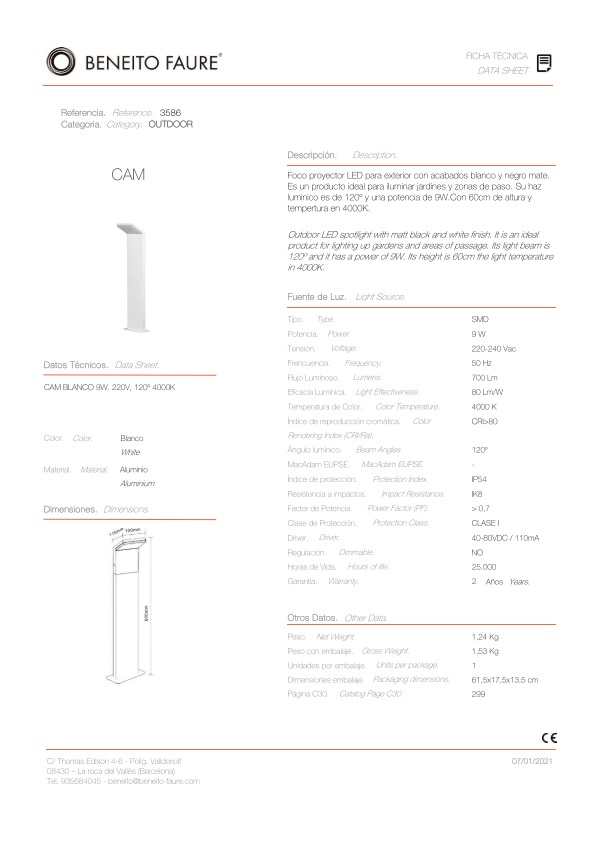 CAM Stehleuchte 60cm 9W 240V 120° 4.000K IP54 WEISS