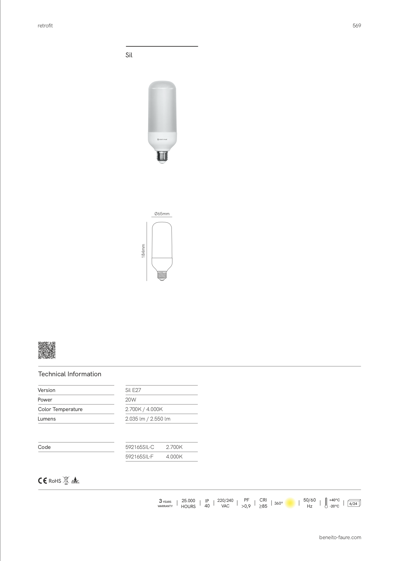Sil 20W E27 ist eine LED-Lampe für E27-Sockel mit 20W Leistung und einer Nennspannung von 220-240V und Farbtemperaturen von 2.700K (2.035 lm) und 4.000K (2.550 lm). Mit CRI>85 gibt die Sil 20W Farben optimal wieder.