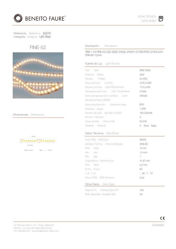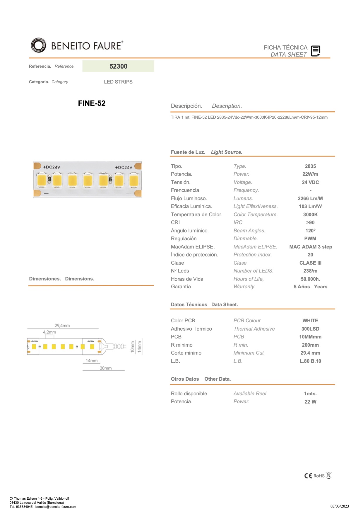 FINE-52 LED-STRIP 1m IP20 24VDC 22W/m CRI90 12mm 2.725 Lm/m