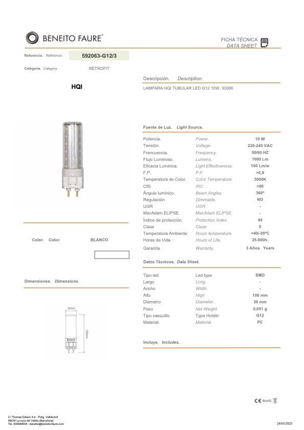 BF592063-G12/3 10W 3.000K - 1.000Lm