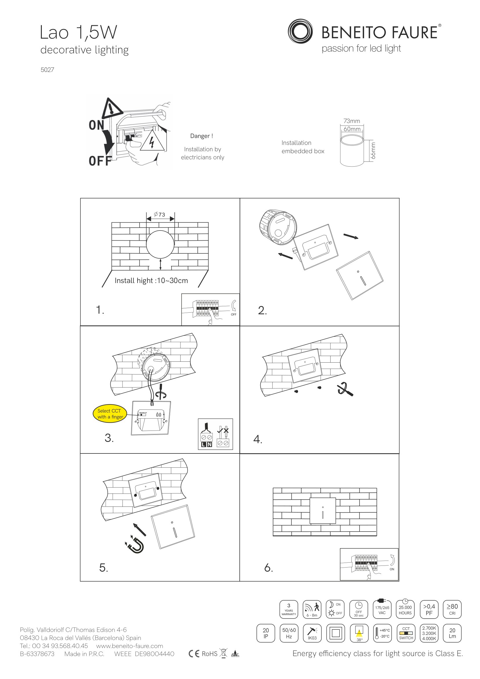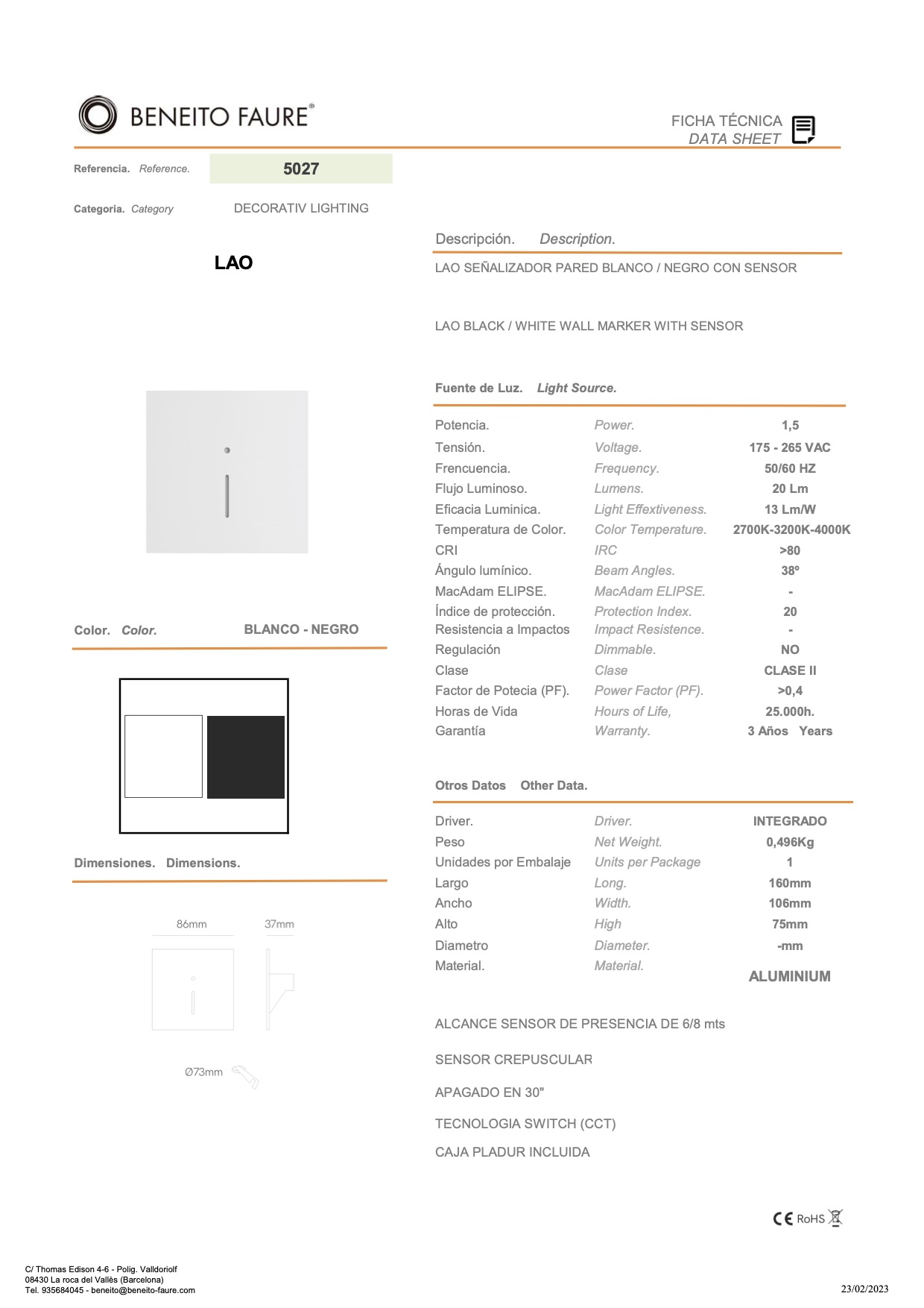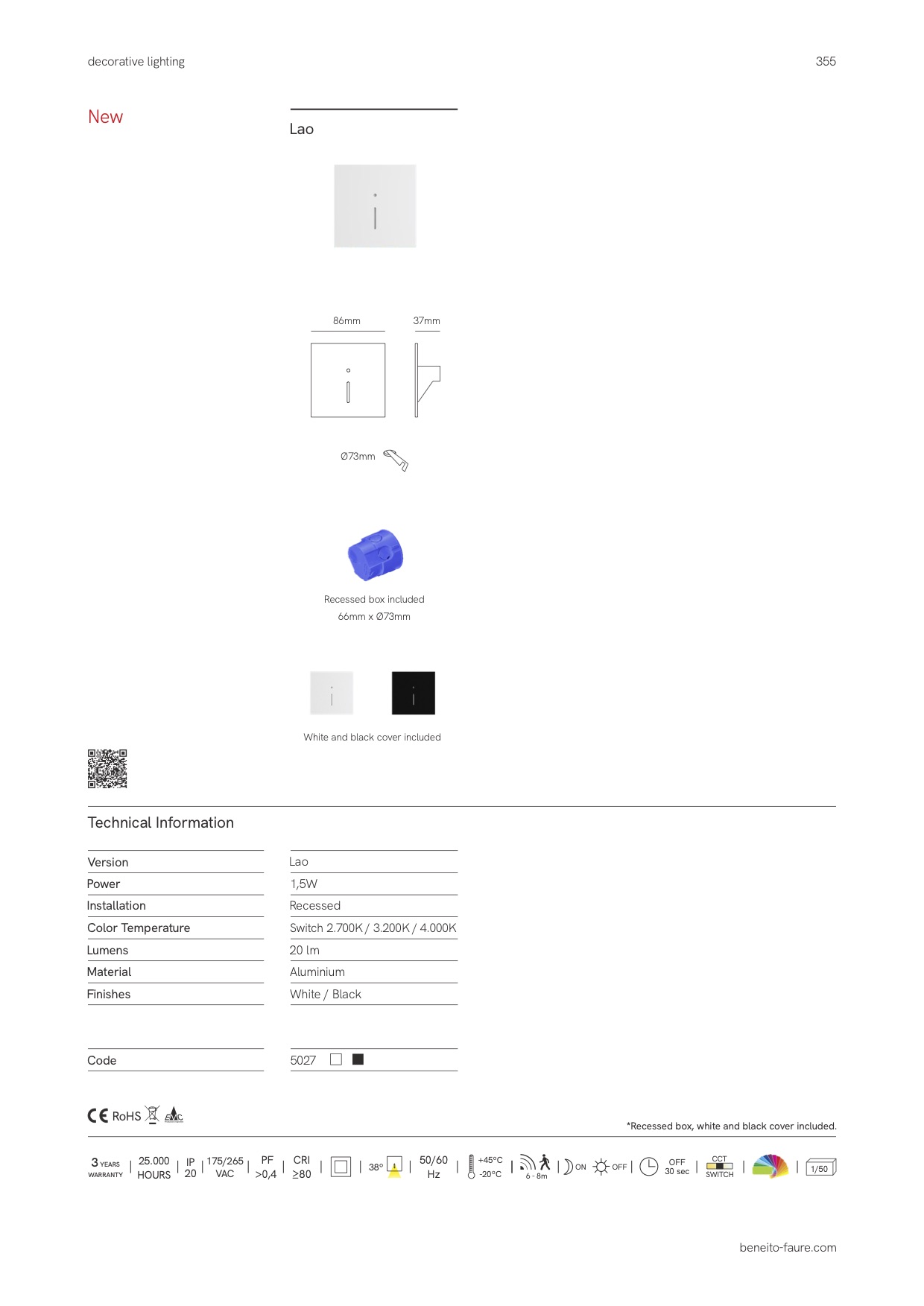 Lao ist eine Einbauleuchte mit 1,5W Leistung für den Innenbereich. Dank ihrer Art der Lichtführung und ihrem Abstrahlwinkel von 38°, ist sie ideal für Treppen, Durchgangsbereiche und Raumbegrenzungen. Diese elegante Leuchte verfügt über die Switch-Technologie, mittels der Sie über einen Switch-Dip-Schalter die Farbtemperatur zwischen 2.700K, 3.200K und 4.000K wählen können. Die Leuchte verfügt über einen Bewegungssensor, so dass sie sich von alleine nach 30 Sekunden ein- und ausschaltet sowie einen programmierbaren Dämmerungssensor.