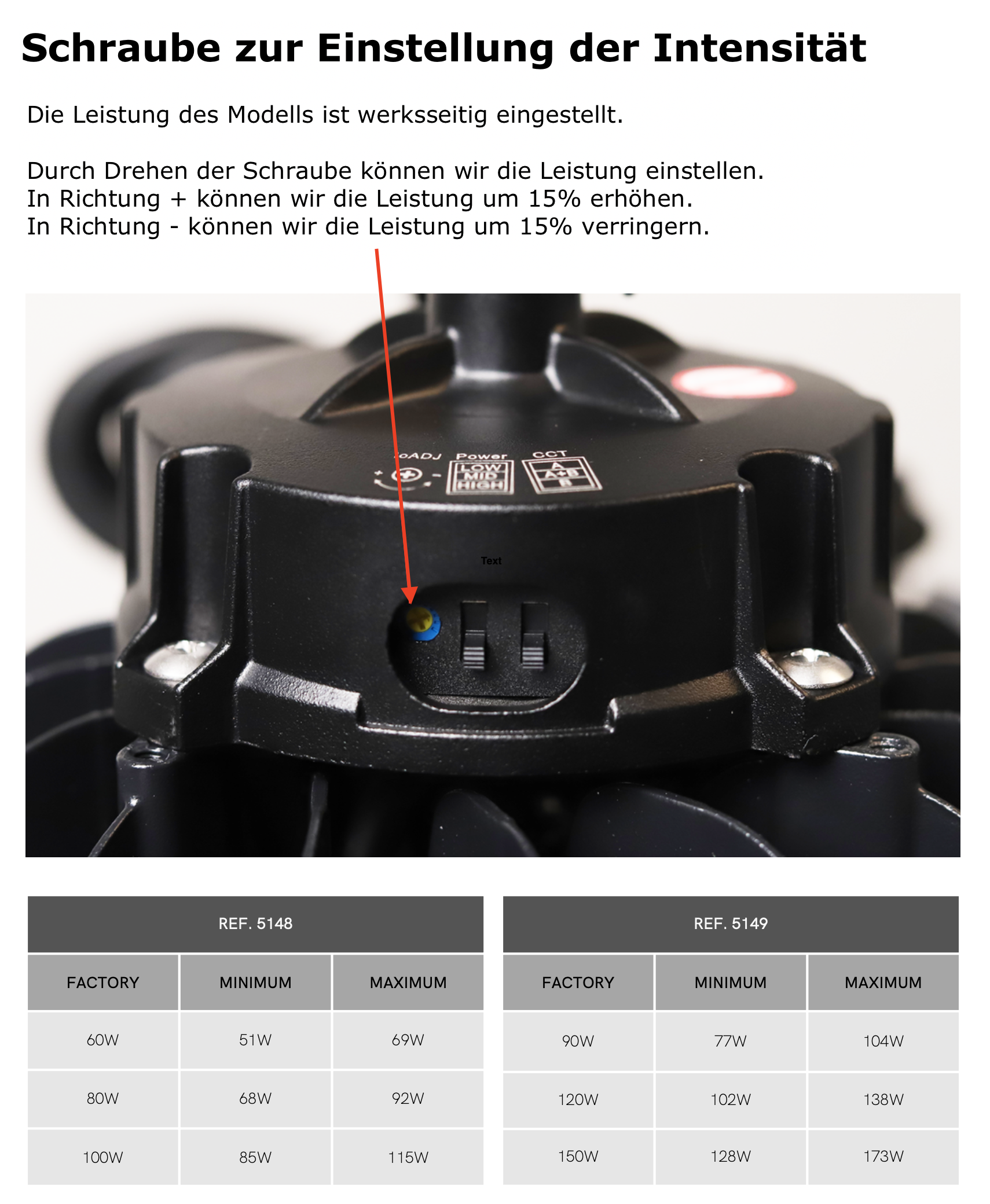 Die Leistung sowie die Farbtemperatur der UFO Lens Switch kann über einen Switch-Dip-Schalter individuell eingestellt werden - siehe Abb. 3. Zusätzlich haben Sie die Möglichkeit über eine Schraube die Lichtintensität der Leuchte um max. 15% zu erhöhen oder zu verringern - siehe Abb. 4.
